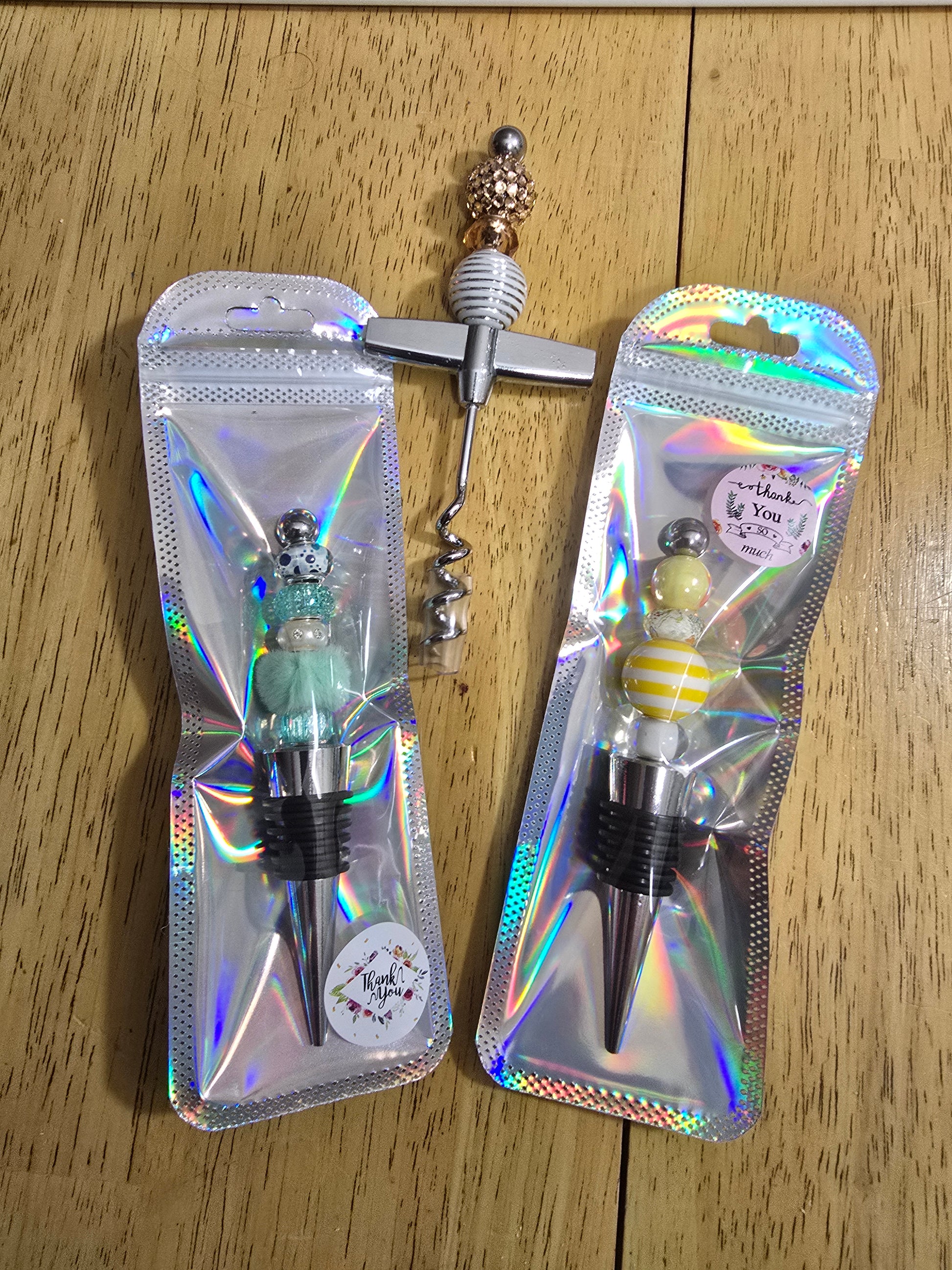 Bubblegum beaded wine stoppers and bottle opener